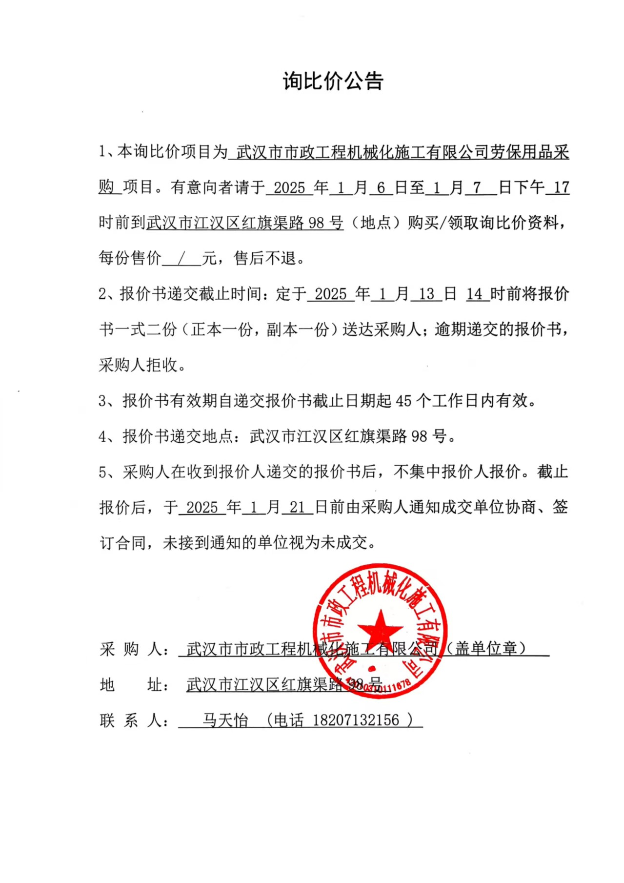 武漢市市政工程機(jī)械化施工有限公司勞保用品采購(gòu)詢(xún)價(jià)公告