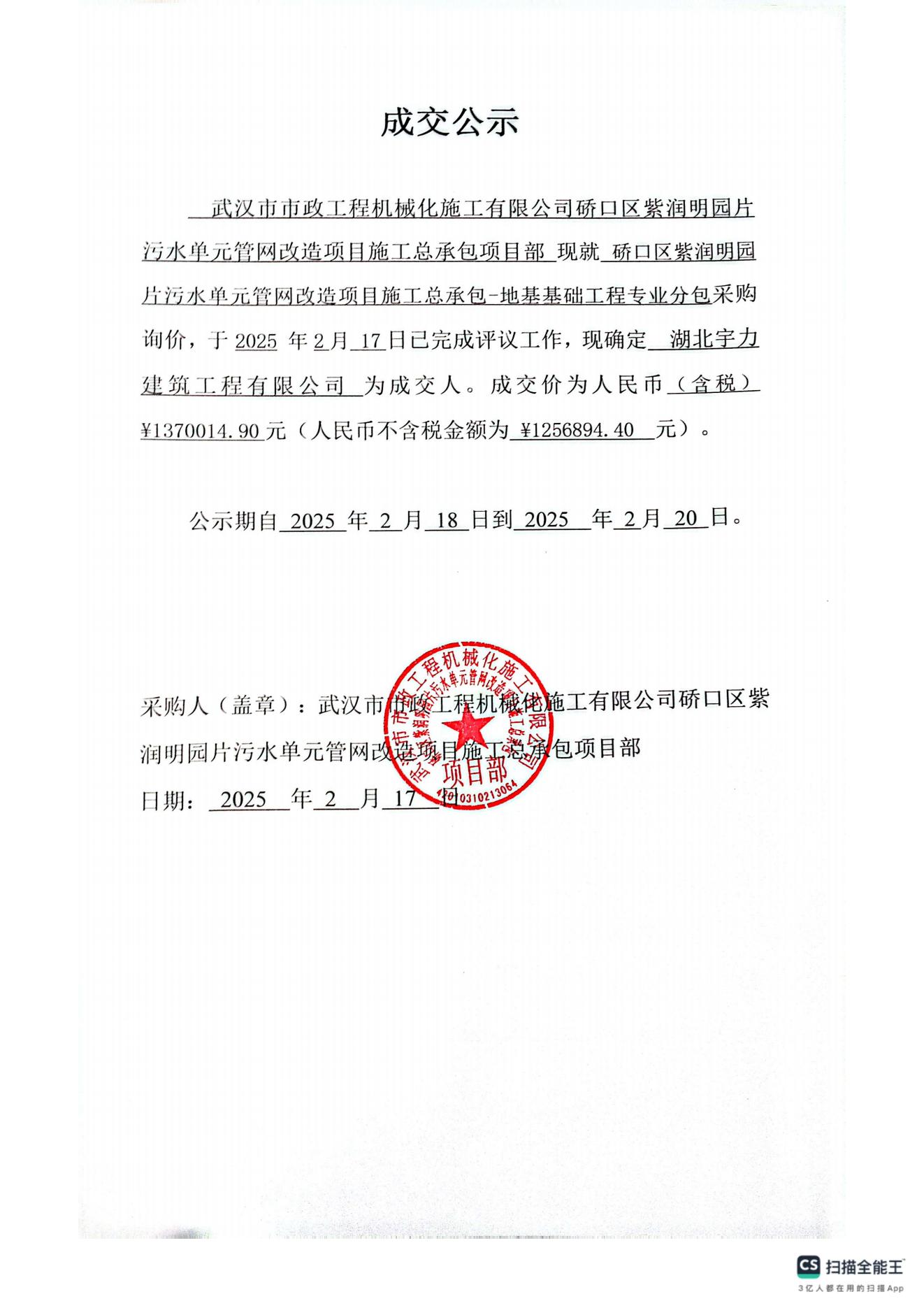 硚口區(qū)紫潤(rùn)明園片污水單元管網(wǎng)改造項(xiàng)目施工總承包-地基基礎(chǔ)工程專(zhuān)業(yè)分包成交公示