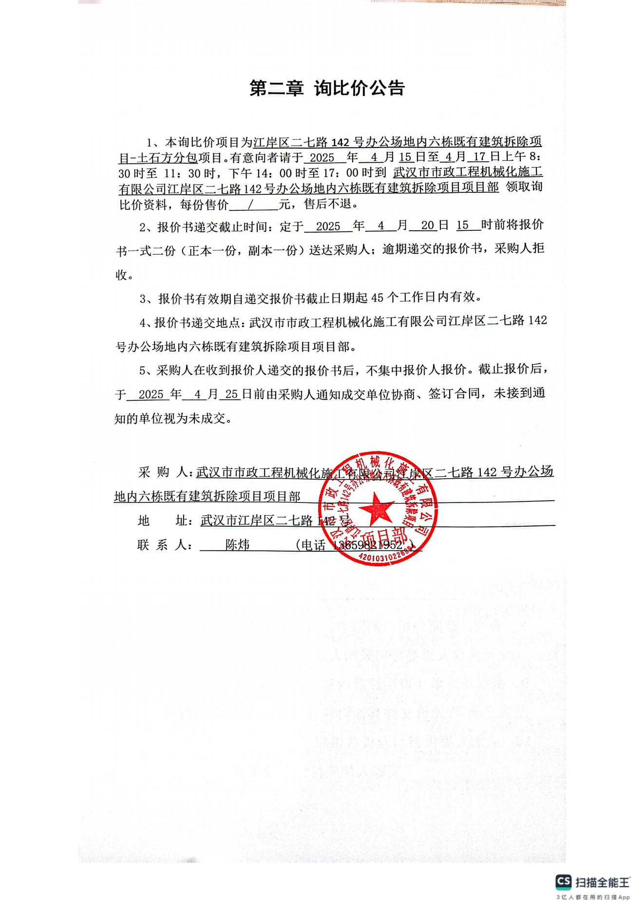 江岸區(qū)二七路142號辦公場地內(nèi)六棟既有建筑拆除項目-土石方分包詢價公告