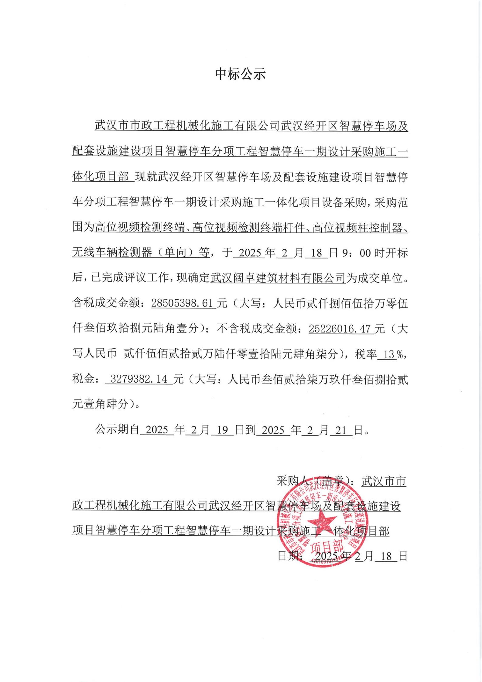 武漢經(jīng)開區(qū)智慧停車場及配套設(shè)施建設(shè)項(xiàng)目智慧停車分項(xiàng)工程智慧停車一期設(shè)計采購施工一體化項(xiàng)目 設(shè)備采購成交公示